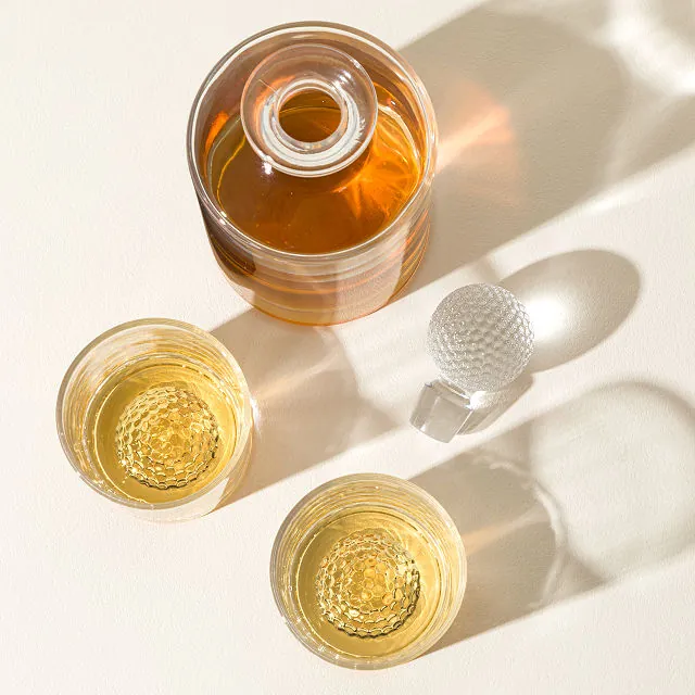 Designed for golf enthusiasts and collectors alike, the 30-oz decanter features a golf ball–shaped stopper, while the two 10-oz glasses display a textured base resembling a golf ball. Sleek, sparkling, and sophisticated, this set doubles as a striking display piece for any home bar or bar cart, making it an unforgettable gift for golf lovers.