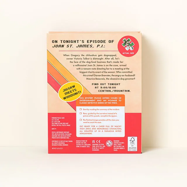 Put on your detective shades and dive into this 500-piece puzzle where the story unfolds as you piece it together. Each section reveals hidden clues, colorful details, and eccentric characters straight out of an ’80s TV crime show. Illustrated by Sally Nixon, the puzzle is bursting with pastel tones, funky fashion, and mysterious fun—all packaged in a vintage VHS-style box that doubles as a collector’s item.