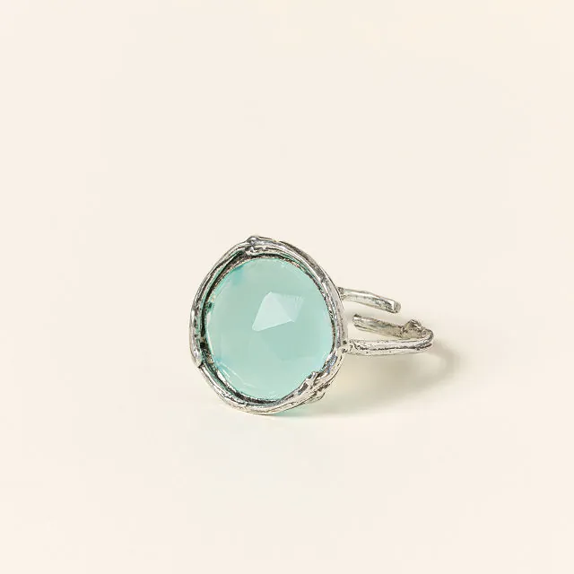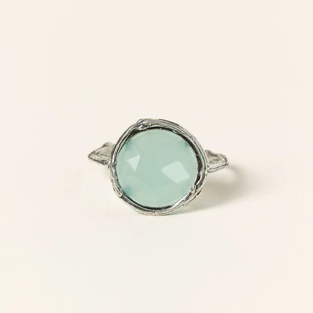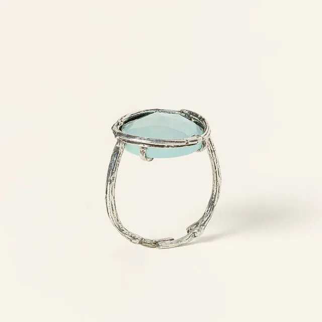 The ring is made from recycled sterling silver and features a beautiful aqua chalcedony cabochon.