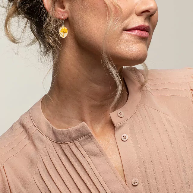 The earrings are handmade with a silver-plated pewter setting. Real flower petals, stems, and leaves are carefully placed inside, sealed with epoxy resin, and finished with sterling silver ear wires.