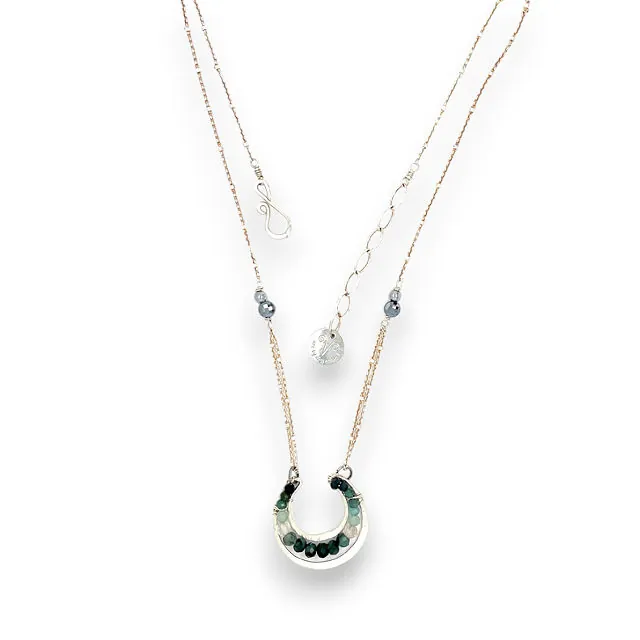 The Blue Rainbow Necklace brings a delicate arc of ocean-hued gemstones to your jewelry collection. Vanessa Savlen’s crescent pendant features emerald, amazonite, green amethyst, and blue tourmaline, set in a textured sterling silver channel. Finished with a sterling silver dot chain and a twinkle of pyrite, this necklace captures a wearable rainbow of hope, luck, and everyday magic.