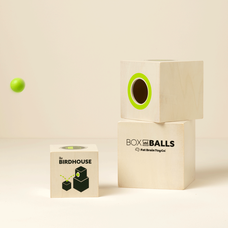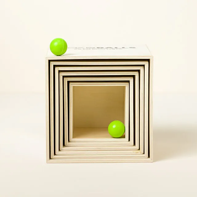 Included: 6 nesting wooden boxes, 8 bouncy balls, illustrated challenge guide