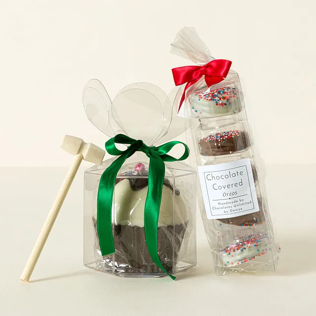 When a cupcake meets a piñata, the result is pure birthday magic. Beneath a shell of white and dark chocolate, you’ll find mini chocolate candies and sandwich cookies ready to spill out with every satisfying smash. Complete with a mini wooden hammer and colorful toppings, the Breakable Birthday Cupcake Gift Set brings fun, laughter, and sweetness to any celebration.