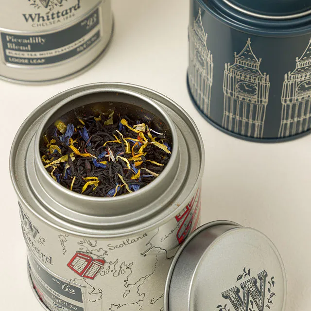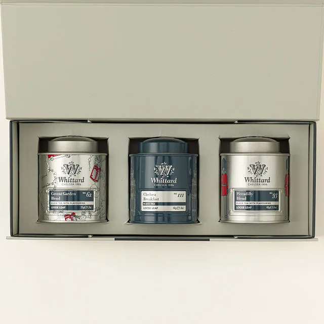 It features three loose leaf black teas: Piccadilly, Chelsea Breakfast, and Covent Garden blends.