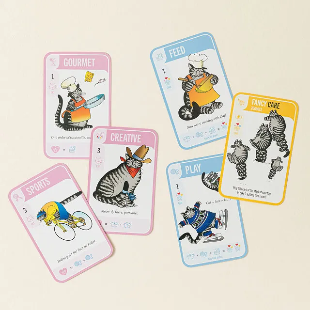 Shuffle the deck and distribute cards to players. Take turns playing cards to entertain, feed, and care for cats to earn points. Use strategy cards wisely to gain an edge, and the player with the most points at the end becomes the ultimate cat companion.