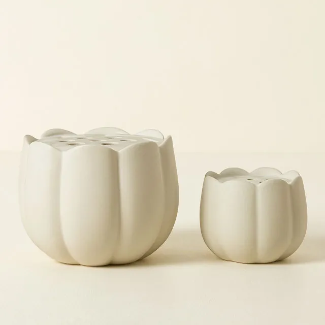 Handcrafted by skilled artisans in a small family-owned workshop in Sri Lanka, this ceramic vase features a tulip-inspired silhouette and a smooth matte finish. Built-in flower frog holes allow you to anchor stems securely, making it easy to shape your arrangement exactly the way you envision it. Choose between a small size for minimalist designs or a larger one for dramatic bouquets—either way, every bloom becomes a centerpiece.
