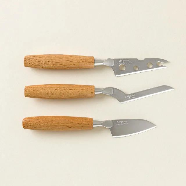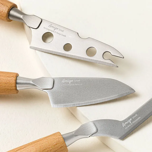 Each knife is labeled for soft, semi-hard, or hard cheeses.