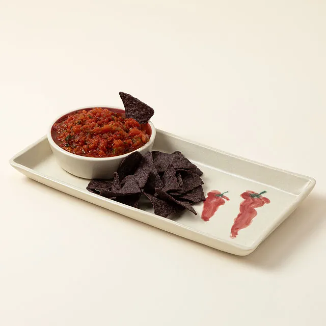 Designed by New York potter Maggy Ames, the Chili Pepper Porcelain Chip & Dip Server is both fiery and functional. Each tray is hand-painted with striking red chili peppers, while the matching dip bowl completes the look with a pop of color and charm.