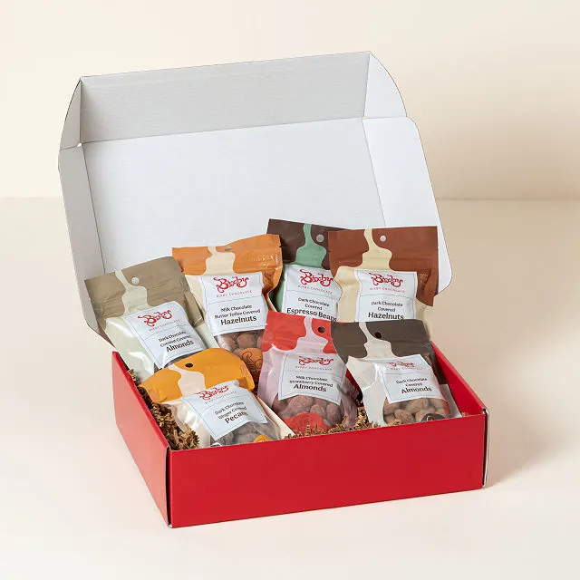 Flavors Included: Dark Chocolate Coconut Almonds, Dark Chocolate Almonds, Dark Chocolate Hazelnuts, Dark Chocolate Espresso Beans, Dark Chocolate Ginger Pecans, Milk Chocolate Butter Toffee Hazelnuts, Milk Chocolate Strawberry Almonds