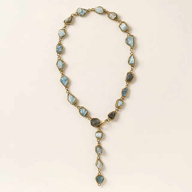 Handmade by jewelry artist Emilie Shapiro, each piece features raw aquamarine stones—untamed, luminous, and reminiscent of sunlit sea glass. Each gem is set in hand-formed brass, creating a natural, organic flow that highlights the stone’s unique texture. With a handcrafted clasp and a 23″ chain, it transforms seamlessly from one style to another, making it the ideal accessory for both casual days and elevated evenings.