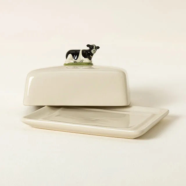Keep your butter soft, spreadable, and charmingly displayed with the Cow Butter Dish. This cream-colored stoneware dish features a pint-sized Friesian cow topper that brings farmhouse flair and practicality to your countertop.