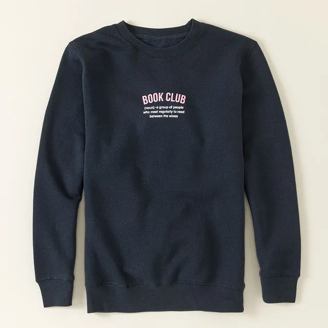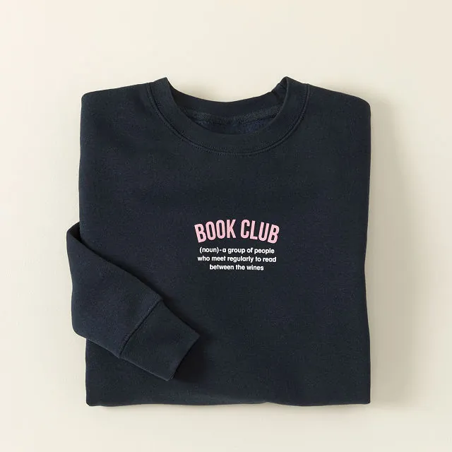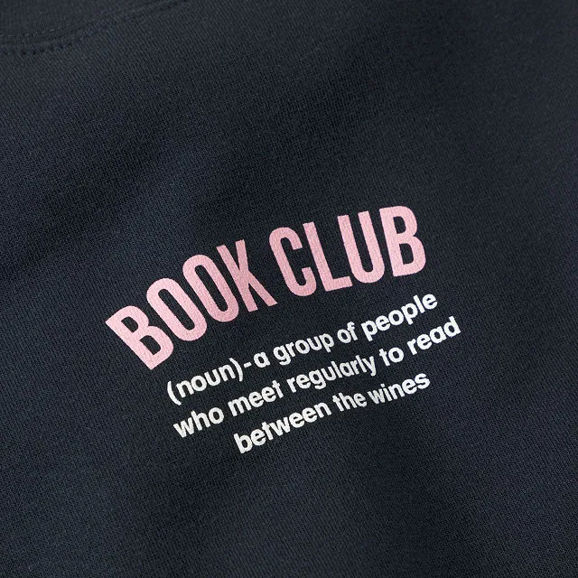 Celebrate two of life’s greatest pleasures reading and wine with the Book Club Sweatshirt. This ultra soft sweatshirt is perfect for those cozy nights at home or gatherings with friends. Featuring a witty message, “Book Club (n)—A group of people who meet regularly to read between the wines,” it is designed for comfort and style.