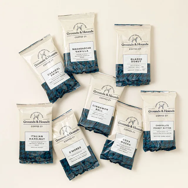 Includes 8 bags, 2.5 oz. each: Caramel Swirl, Chocolate Peanut Butter, Cinnamon Roll, Coco Mocha, Glazed Donut, Italian Hazelnut, Madagascar Vanilla, and S’mores.