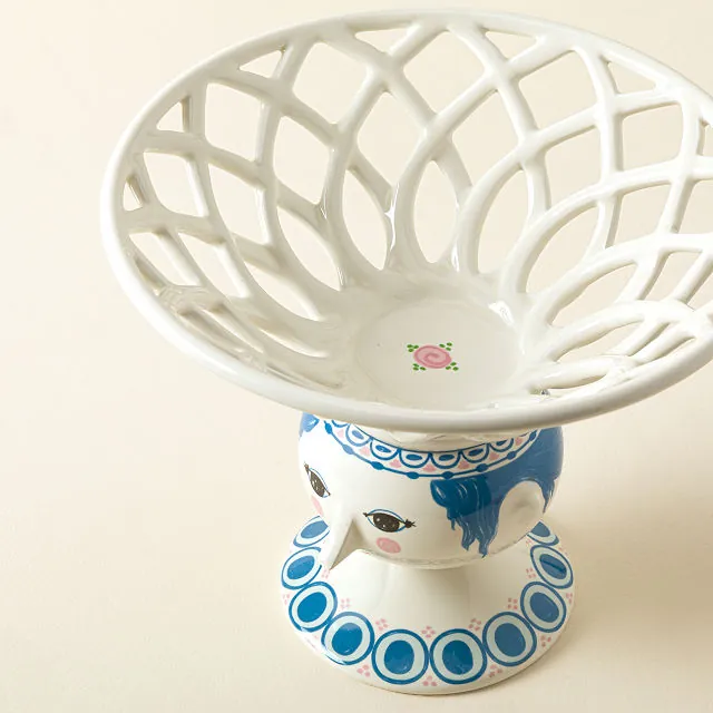 Bring a touch of Scandinavian charm to your table with the Fruit Lady Pedestal Bowl. Featuring a woven basket top and a serene, smiling face, this playful ceramic piece is both functional and delightfully decorative. Ideal for displaying fruit, flowers, or snacks, it adds a joyful and artful presence to any room.
