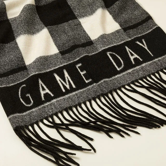 Notes: Soft, snuggle-worthy fabric with bold plaid and “GAME DAY” fringed hem