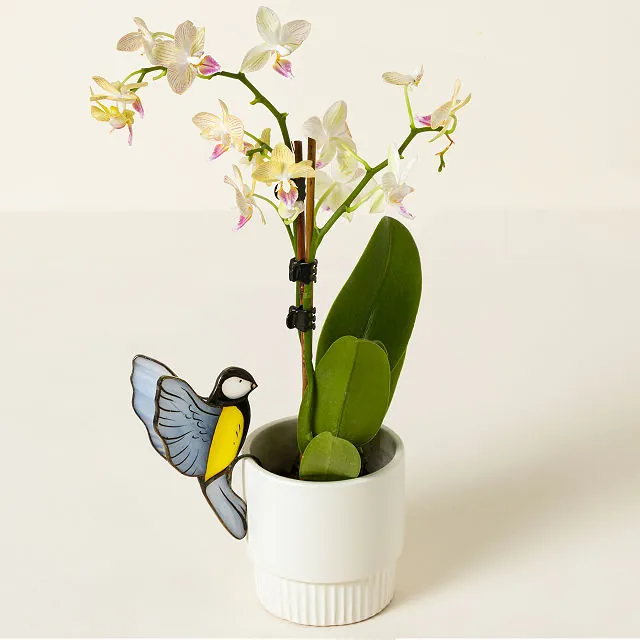 Crafted by skilled artisan Anna Avgul, each songbird pot hugger rests gracefully on the edge of your planter, turning an ordinary pot into a dazzling display. Its discreet wire hook ensures a secure fit, while the shimmering glass catches the light beautifully, creating a magical scene among your blooms.