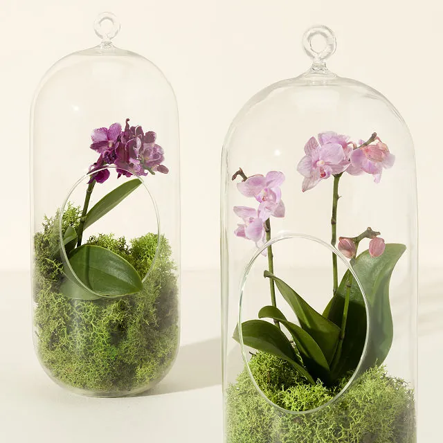 Orchids are renowned for their grace and beauty, making them one of the most cherished flowers in the world. Our Hanging Orchid Terrarium elevates this beauty, housing a striking mini orchid in either Pink or Purple, inside a sleek, hanging glass terrarium.
