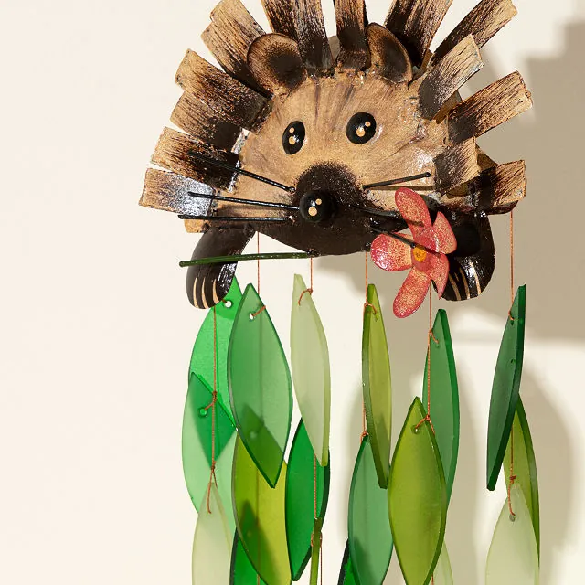 Each chime is crafted from powder-coated metal and colored glass, creating a delightful shimmer as it moves in the wind. Designed for both indoor and outdoor use, this piece combines durability with handcrafted beauty. Every detail of Harold—the spiky quills, playful expression, and radiant glass tones—adds personality and warmth to any setting.