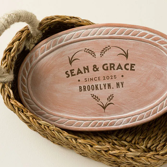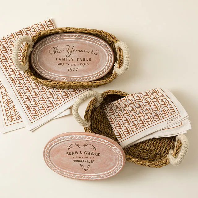Every detail of this bread-warming set is made to make your dining experience special. The handwoven jute and seagrass basket holds a terracotta warming stone that radiates gentle heat to keep your bread fresh and soft. Personalize the stone with names, dates, or heartfelt messages—creating a keepsake that celebrates the heart of your home.