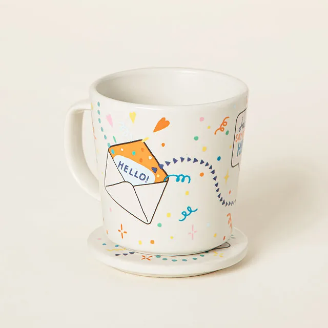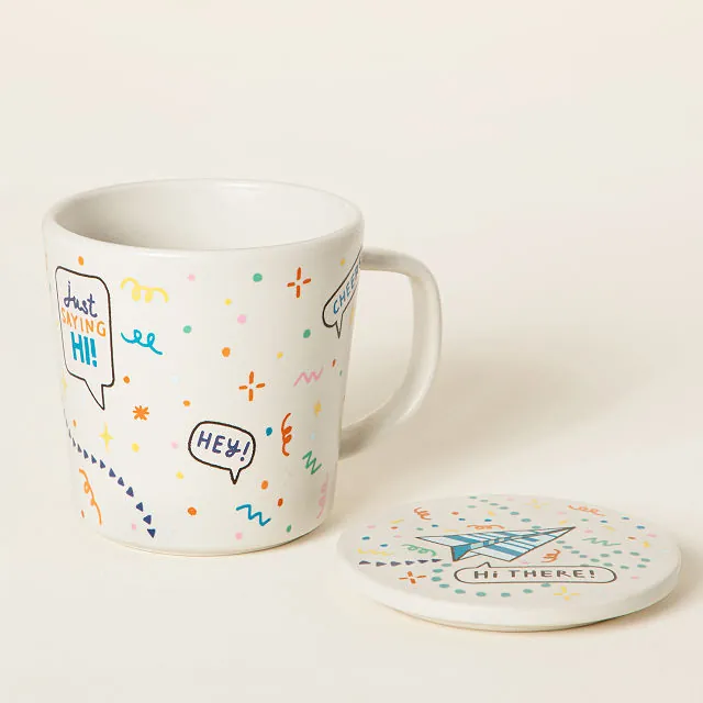 Brighten mornings—or any moment—with the Hi There! Mug. This playful ceramic mug features confetti-inspired colors and uplifting messages like “Hello!” and “Cheers!” paired with a matching coaster that doubles as a lid. Perfect for coffee, tea, or cocoa, it turns a simple beverage into a warm, thoughtful experience for yourself or someone special.