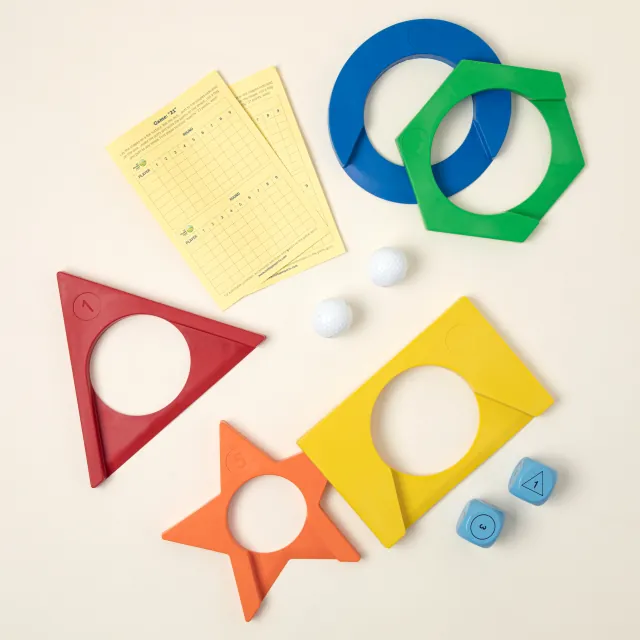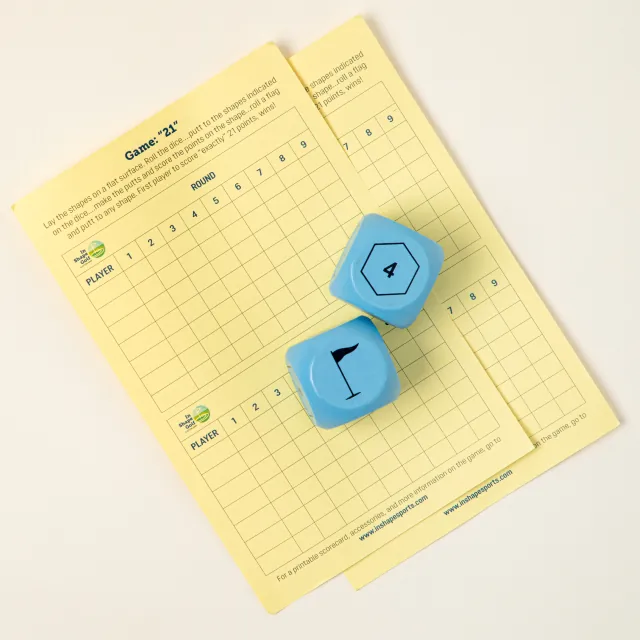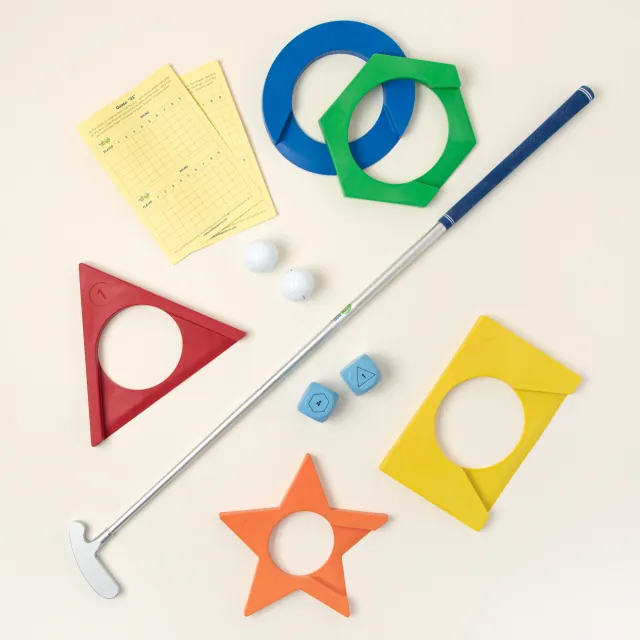 Arrange the five uniquely shaped targets, each offering varying levels of difficulty. Use the custom-made wooden dice to dictate your shots, and challenge yourself or friends to reach exactly 21 points. Prefer a relaxed game? Simply enjoy putting for fun without keeping score.