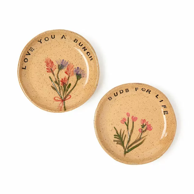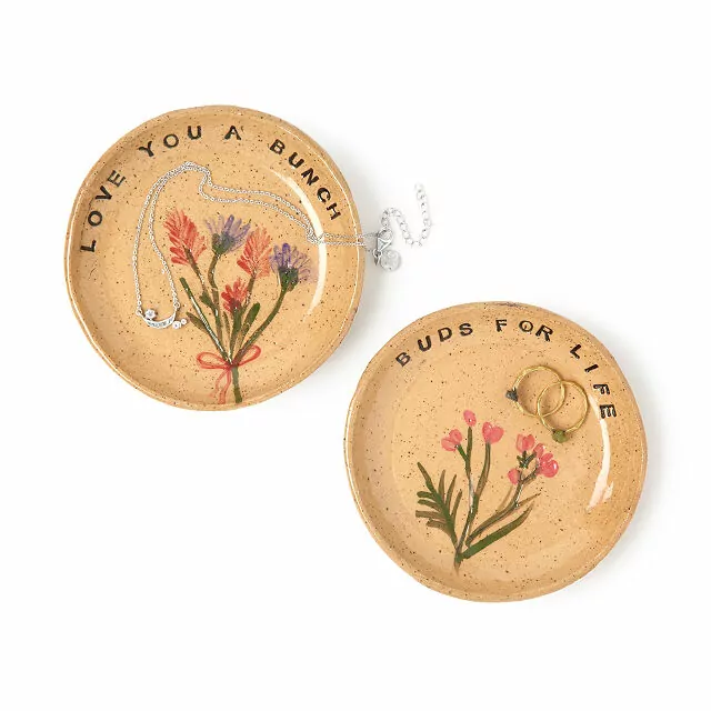 This delightful piece is made with real flowers pressed into the clay, creating a beautiful, one-of-a-kind design. Each trinket dish is hand-painted with the impression left by the flowers, adding a playful touch with floral puns such as “Love You a Bunch” or “Buds for Life.” This dish is the perfect size for holding jewelry, small trinkets, or even as a decorative saucer for your favorite mug.