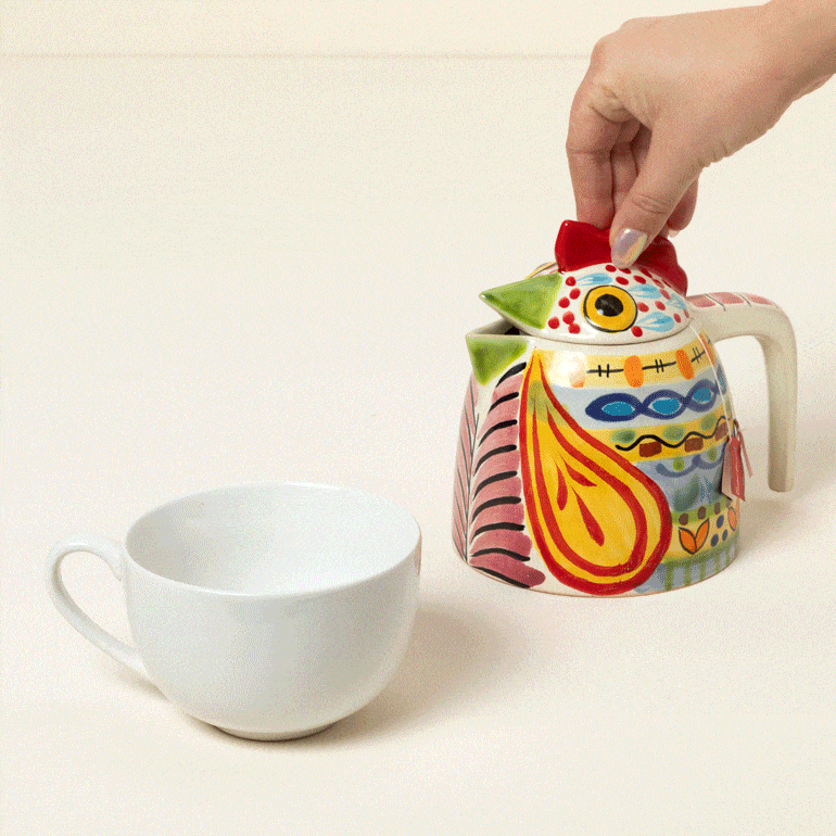 Designed for tea lovers who value both beauty and utility, this teapot is crafted using time-honored majolica techniques. Its lively rooster motif and rich hand-painted designs make it a centerpiece for your table, while its functional features ensure a seamless brewing experience. Dishwasher-safe for convenience, but remember: it is not microwave-safe. Pair it with matching pieces like the Hand-Painted Rooster Creamer & Sugar Jar or Rooster Mug for a complete, charming set.
