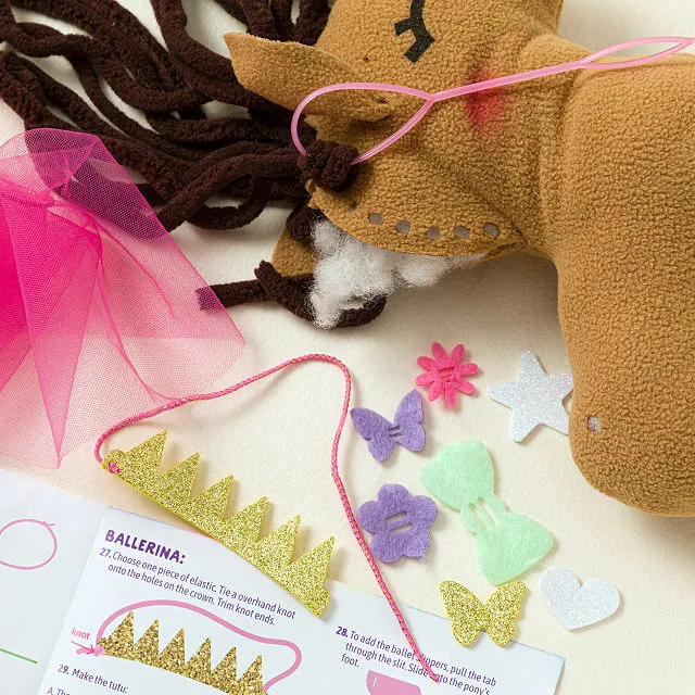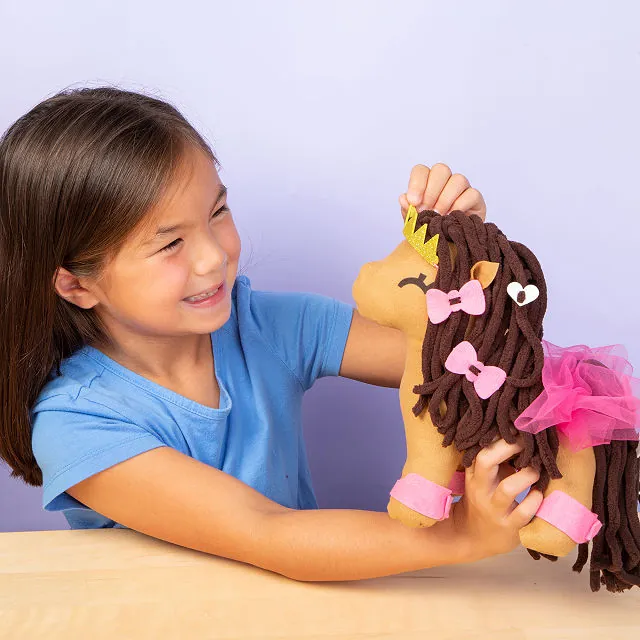 Choose between the pre-sewn pony or unicorn. Use the included yarn, threading tool, and stuffing to assemble the mane, tail, and final stitching. Then, decorate with accessories to create a personalized, imaginative friend ready for endless play.