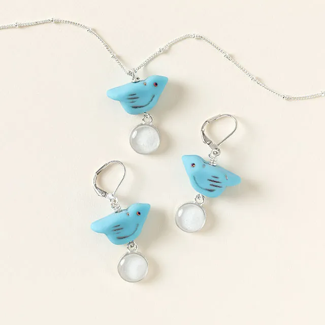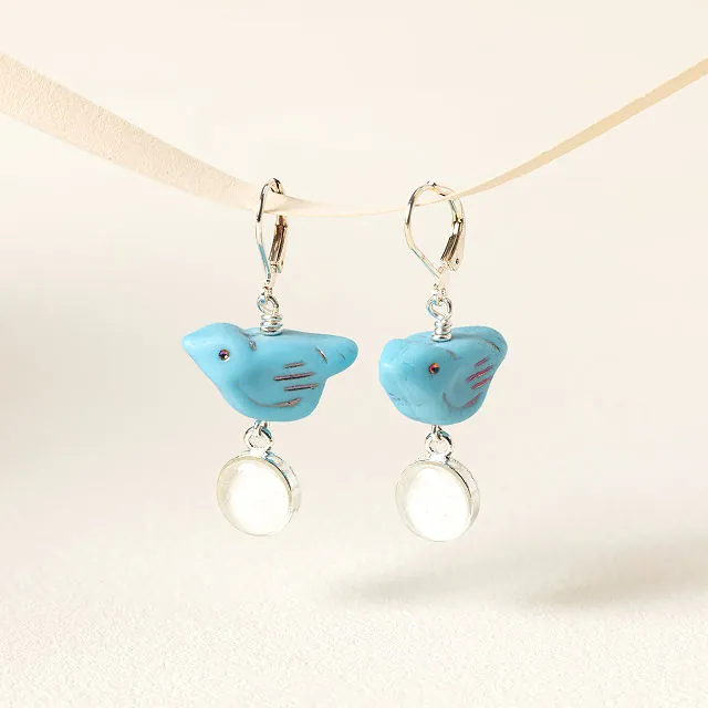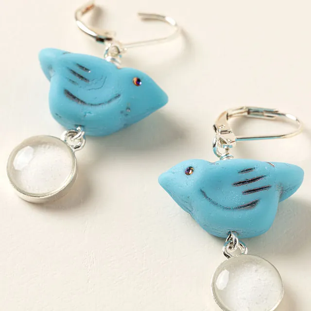 Handcrafted by Susan Forker in Bucks County, Pennsylvania, each earring features a bright turquoise Czech glass bird guarding a miniature “egg” made from repurposed vintage book pages, encased in a resin dome for durability. The sterling silver–plated leverbacks provide secure comfort while showcasing a lively swing with every movement. This design combines nostalgia, storytelling, and wearable art for a truly unique accessory.