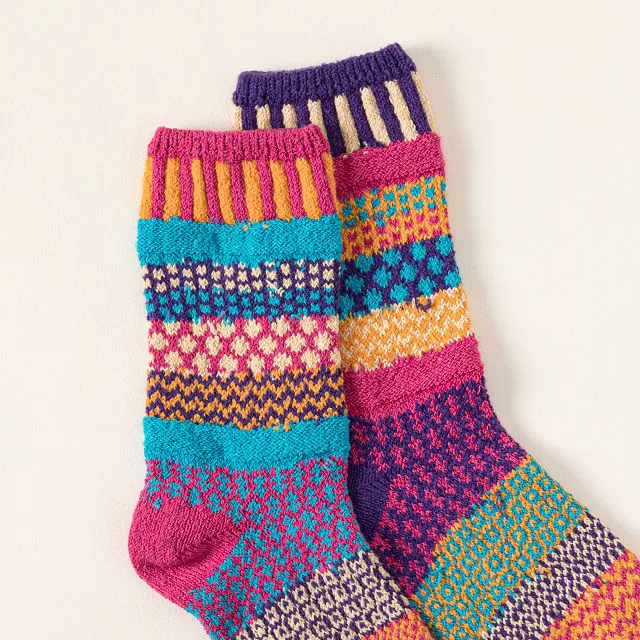The Mismatched Crew Socks are machine washable and can be tumble dried on low heat for easy maintenance.