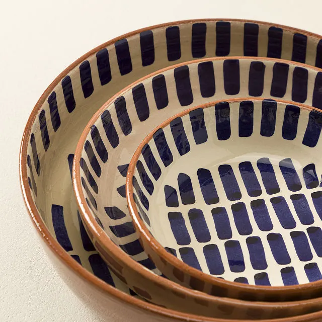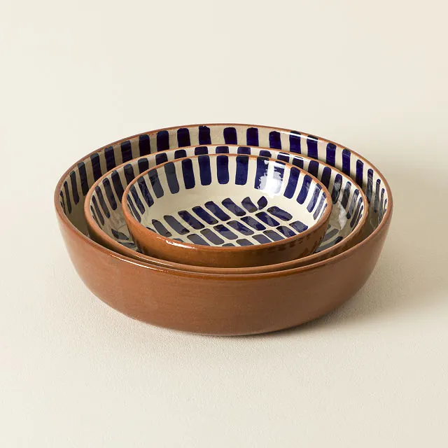 Timeless tradition meets modern sophistication in the Moroccan Nesting Dishes – Set of 3, handcrafted by skilled artisans using authentic terra-cotta pottery. Each dish is wheel-thrown and finished with a smooth white glaze, featuring bold blue stripes that evoke the serene beauty of the Moroccan coast. Perfect for everyday meals or special occasions, this trio adds a refined touch to any table.