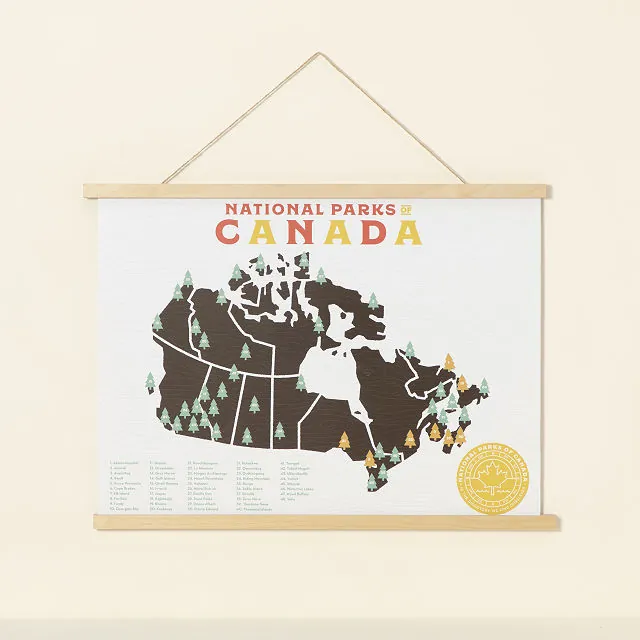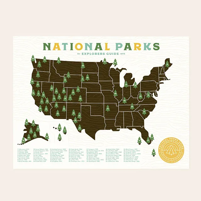 This map is not just an ordinary map it’s a functional piece of art. With its vintage, adventure-themed design, it allows explorers to mark each National Park they’ve visited using the included tree stickers. The map includes all 63 U.S. National Parks and 48 Canadian parks, arranged in the order they were established.