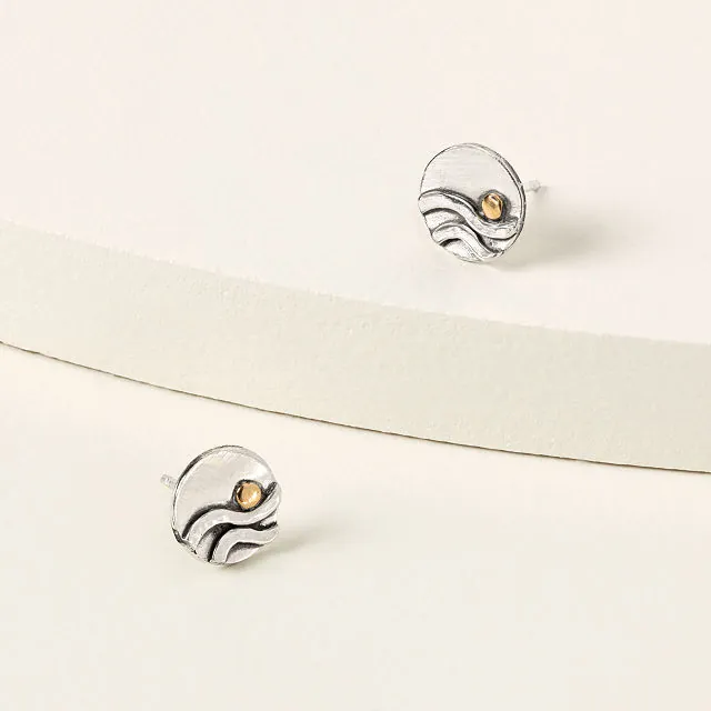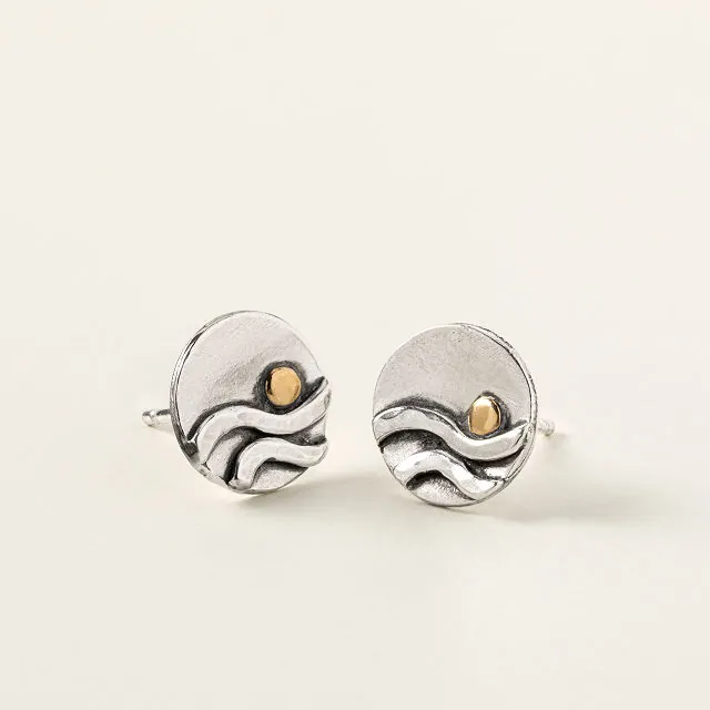 Capture the serene beauty of the ocean with Ocean Reflections Stud Earrings, handcrafted to evoke memories of seaside tranquility. These stunning earrings, made from recycled sterling silver and 22-karat gold, feature a minimalist yet elegant design of shimmering waves and golden moons. Whether you’re reminiscing about a beachside vacation or simply looking for a timeless piece to elevate your outfit, these earrings provide an instant connection to the natural world.