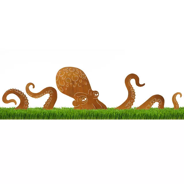 The Octopus Garden Sculpture features a lifelike octopus design with tentacles that appear to be emerging from the ground. Each tentacle is carefully shaped and positioned to create a sense of movement and fluidity. The sculpture’s rust patina gives it an authentic, weathered look that blends seamlessly with natural surroundings.