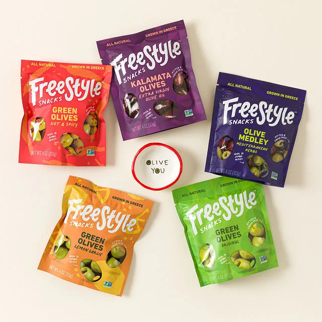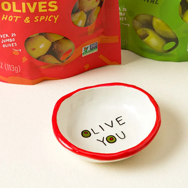 The Olive You Sampler Gift Set offers a convenient and mess-free way to enjoy five savory varieties of olives. Each resealable pouch contains 4 oz. of firm, large, and crisp olives, ensuring every bite is bursting with flavor. This set also includes a charming handmade ceramic dish, making it perfect for serving.