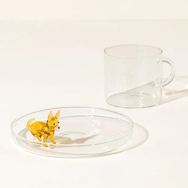 Features: Handmade, flame-worked dog figurine, matching saucer, thermal-shock resistant, available in five breeds