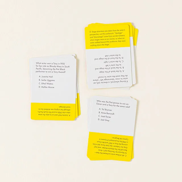 Shuffle the cards, draw a question, and test your knowledge of Broadway musicals, plays, and backstage facts. Suitable for groups of all sizes and skill levels, it’s perfect for casual fun or competitive game nights.