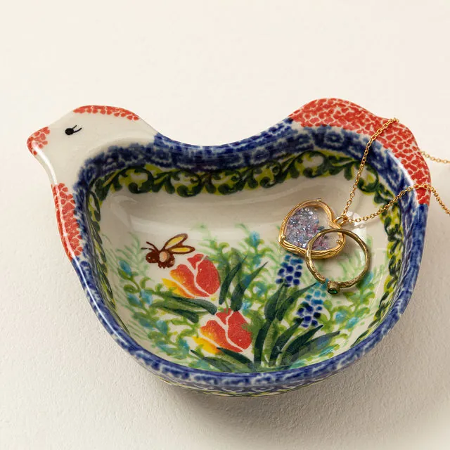 Handmade using traditional techniques, the Polish Hen Pinch Pot is perfect for holding salts and seasonings, serving dipping sauces, or keeping small treasures like jewelry safe. Its floral details and buzzing bee motif make it as decorative as it is practical.