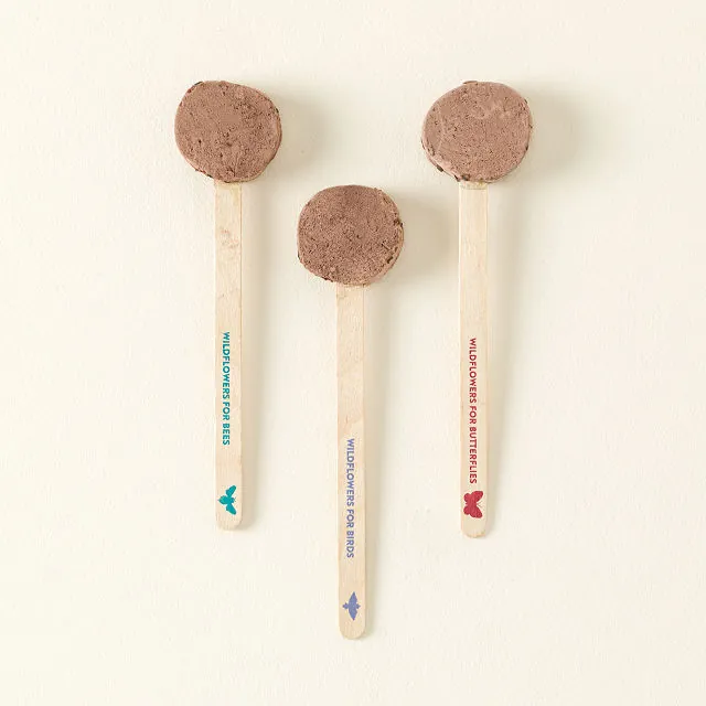 Simply plant half of the pop into soil — indoors or outdoors after the last frost — and water regularly. The biodegradable wooden stick doubles as a garden marker, helping you track what’s growing. Each pop contains clay, worm castings, and nutrient-rich materials to help your wildflowers thrive naturally.