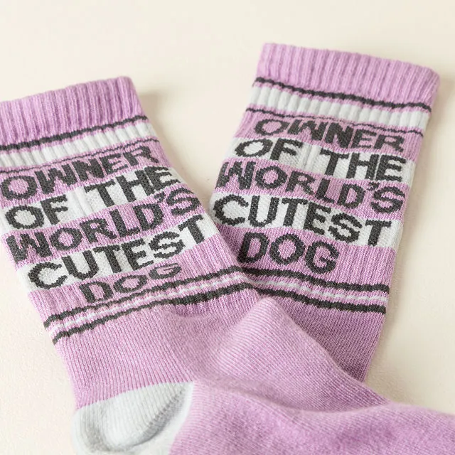 These unisex socks feature the charming phrase “Owner of the World’s Cutest Dog” on a pink-and-white background. Crafted from a cotton-nylon-spandex blend, they offer softness, stretch, and durability for everyday wear. Perfect for lounging, casual outings, or gym sessions, they combine playful style with functional comfort for dog parents of all ages.