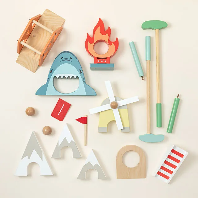 Set Includes: 8 wooden obstacles (shark, windmill, bridge, ramp, 3 mountains, hole with flag), 2 adjustable-height golf clubs, and 2 wooden balls