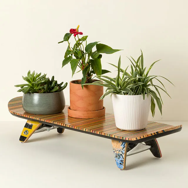 Each display stand is crafted from recycled skateboard decks, featuring mid-century inspired legs and a one-of-a-kind design that celebrates the boards’ history. With a maximum weight of 50 lbs, it’s ideal for everyday objects or electronics while adding personality and grit to any space. No two stands are alike—making it a bold and meaningful addition to your home or office.