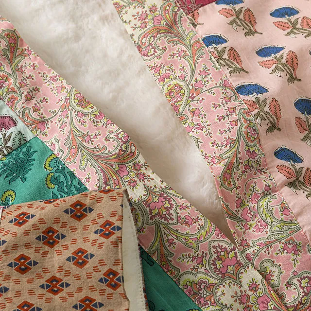 Each robe is a masterpiece, crafted from vibrant repurposed saris stitched together in mesmerizing patterns. The outer layer showcases the rich hues and intricate designs of traditional Indian saris, while the inner fleece lining provides unparalleled warmth and softness.
