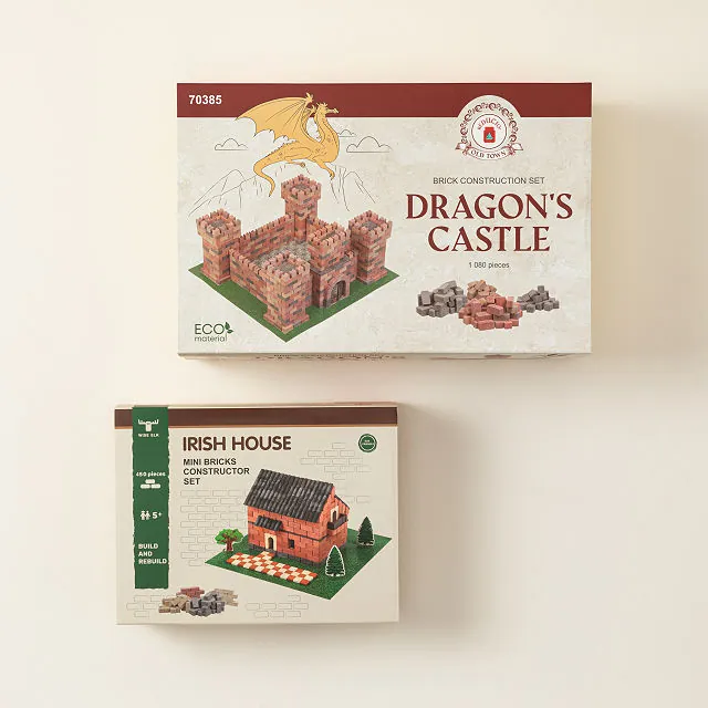 Experience the joy of building with real gypsum bricks and ceramic tiles that bond with safe, water-soluble glue. When it’s time for a new creation, simply soak the pieces, separate, dry, and start again. Choose from two engaging styles: the cozy Red Farmhouse with 450 bricks or the majestic Dragon’s Castle with 1,080 pieces.
