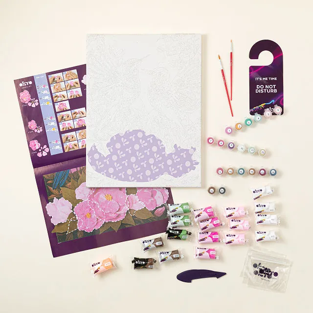 Paint the raised outlines on the canvas using the numbered acrylic paints and brushes provided.