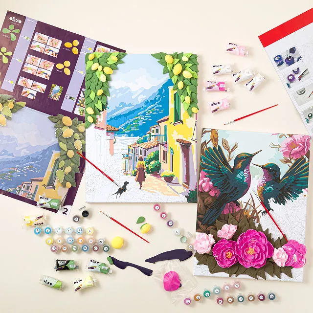 Each set includes a canvas, brushes, numbered acrylic paints, clay & paste palettes, a sculpting tool, and instructions.