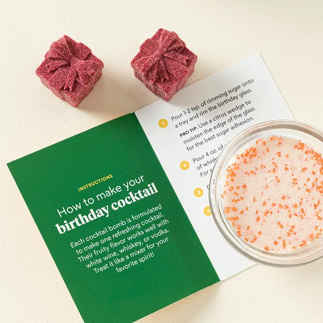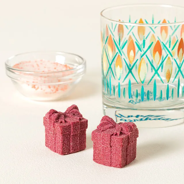Mix four fruity, celebratory drinks by simply dropping a cocktail bomb into your favorite spirit and topping it with seltzer or lemon-lime soda. The mandarin orange rimming sugar adds a professional touch, while the glass’s cheerful wraparound birthday candle design reveals itself when filled.