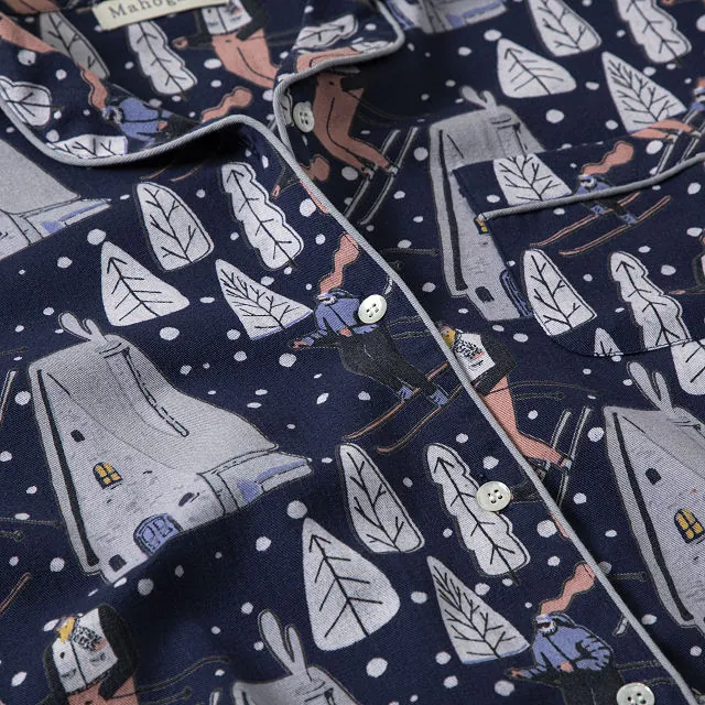 This playful and cozy pajama set is the ultimate way to bring winter fun indoors. With a charming winter-themed design featuring skiers, snow-covered trees, and quaint chalets, it’s perfect for anyone who loves winter sports or simply enjoys the serene beauty of snow-covered landscapes. The high-quality brushed cotton ensures softness against the skin, while the white piping adds an elegant touch for a tailored look.
