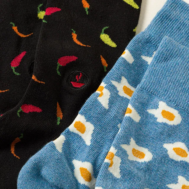 Maximize your comfort with these thoughtfully crafted socks. Each pair is made from a soft cotton-poly blend with terry padding in the toes and heels, offering exceptional coziness for all-day wear. Choose from two playful designs—Sunny Side Up or Hot Pepper—to bring a touch of joy to your daily routine.