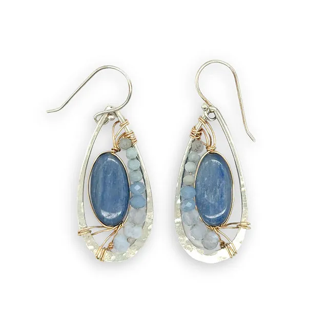 Created by Vanessa Savlen, each pair features kyanite ovals, blue lace agate, and faceted cat’s eye gemstones, finished with hand-hammered sterling silver drops and gold-filled wire accents. Lightweight and comfortable, these earrings are designed to be worn all day while maintaining a polished, artistic aesthetic. Perfect for casual wear or adding a serene touch to a more formal outfit.